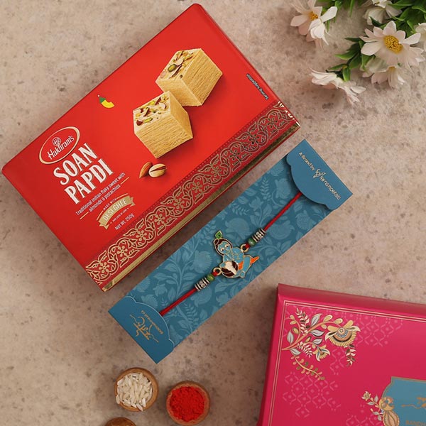 Product Details , One Bal Krishna Rakhi, Bal Krishna Rakhi is categorically designed for kids who are fond of devotional cartoon characters, This Rakshabandhan, gift your brother a classic designer Rakhi, Haldiram''s Soan Papdi, Weight- 250 gms