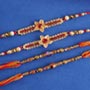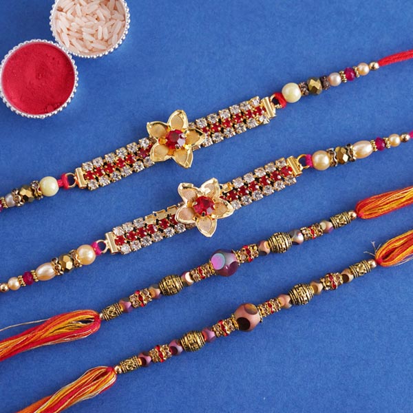 Product Overview: • Rakhi Type: Two stone Rakhis and two beaded Rakhis • Set Type: Set of 4 Rakhi • Recipient: Brothers • Color: Multicolored • Material Used: Stones, beads, gold-plated metal, and silk thread • Roli & Chawal pack and containers are included with Rakhi set