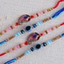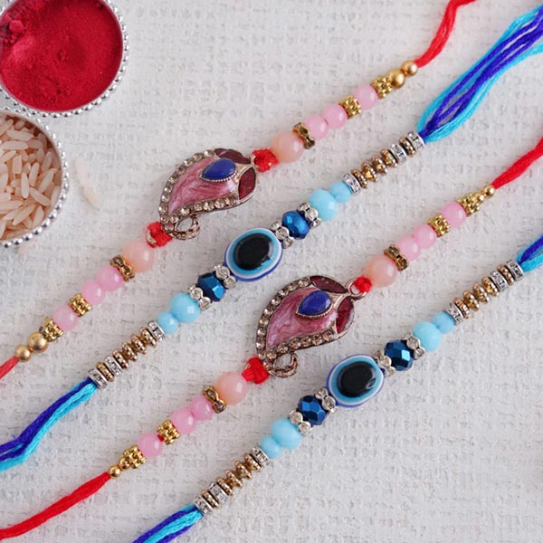Product Overview: • Rakhi Type: A pair of each evil eye Rakhi and stone Rakhi • Set Type: Set of 4 Rakhi • Recipient: Brothers • Color: Multicolored • Material Used: Stones, beads, gold-plated metal, and silk thread • Roli & Chawal pack and containers are included with Rakhi set