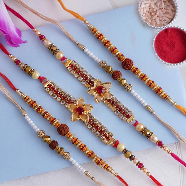 Product Details: • Rakhi Type: Four Rudraksha Rakhis and Two Stone Rakhis • Set Type: Set of Six • Recipient: Brother • Color: Multicolored • Material Used: Gold-plated metal, Rudraksha Motifs, stones, beads, and a silk thread • Brand: sendrakhi.com • Roli & Chawal with containers are included with this Rakhi set
