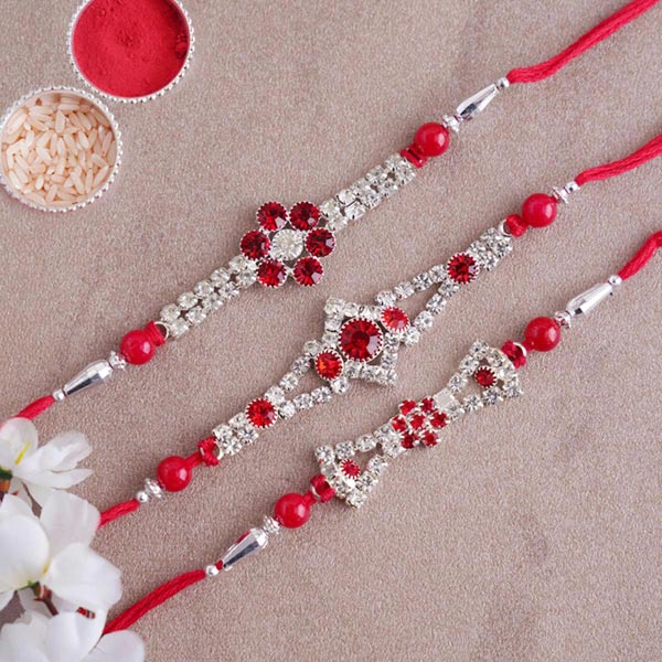 Product Overview: • Rakhi Type: Stone Rakhi • Set Type: Set of 3 Rakhi • Recipient: Brothers • Color: Multicolored • Material Used: Colorful pearls, stones, silver-plated metal, and silk thread • A pack Roli & Chawal and containers are included with Rakhi set