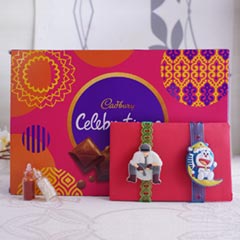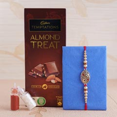 Rakhi •Rakhi Type: Stone Rakhi in a box •Set Type: Set of 1 •Recipient: Brothers •Color: Multicolored •Material Used: Stones, beads, and silk threads Chocolates •4 Piece Ferrero Rocher of 50gm •1 Temptation Almond Treat of 72gm •2 Bourneville of 31gm Other Items: •A packet of Roli and Chawal with containers are also included •A designer tray is also included with this Rakhi with chocolates hamper