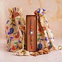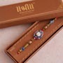Rakhi • Rakhi Type: Stone Rakhi in a box • Set Type: Single Rakhi • Recipient: Brothers • Color: Multicolored • Material Used: Gold-platted metal, beads, stones, and silk threads • A packet of Roli and Chawal with containers Dry fruits • 200 gm Pistachios in a designer potli • 200 gm Almonds in a designer potli