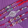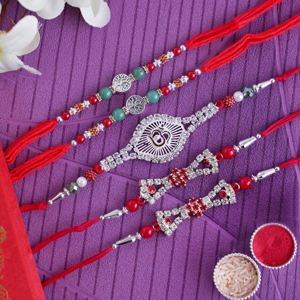 Product Overview: • Rakhi Type: Five silver Rakhis • Set Type: Set of 5 Rakhis • Recipient: Brothers • Color: Multicolored • Material Used: Beads, peals, Ads, silver-plated metal, and silk thread • Pack of Roli & Chawal and containers are free with Rakhi set