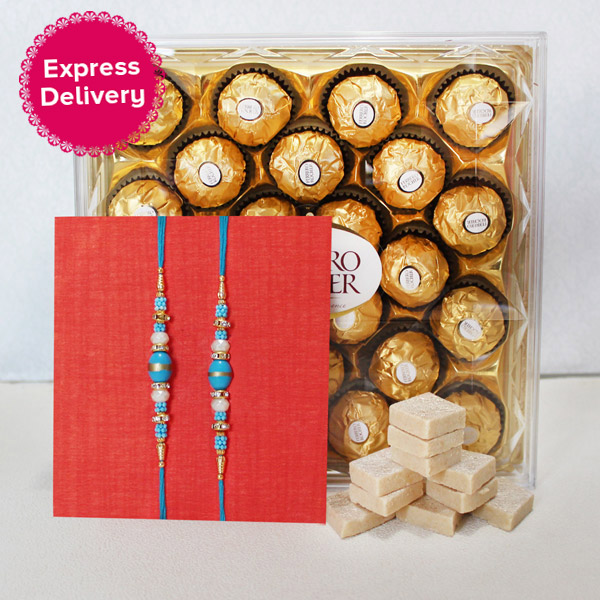Sweets and cheerful! Gifts hampers like these are truly relevant to these two terms. So when you are willing to make Raksha Bandhan memorable for your dearest brothers with sweet moments of sharing, this is the hamper to make choice for. Hurry to place order as it’s the last call to send this gift to brother. It contains: • 24 Piece Ferrero Rocher 300gm • Delectable Kaju Katli of 250gm • 2 White and Blue Beaded Rakhis • Chawal and roli for tika