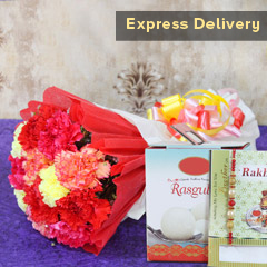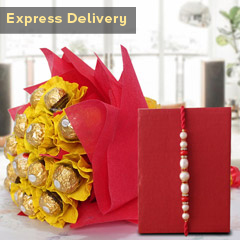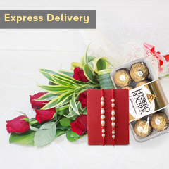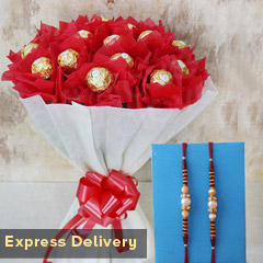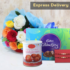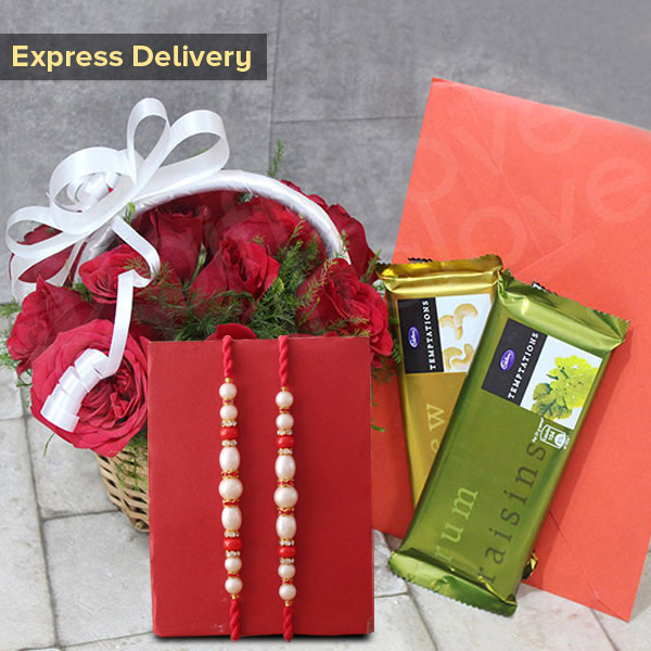 It Contains: • 2 Rakhis • 2 Temptation Chocolates each weighing 72 gm • 1 Rakhi Greeting Card • 1 Basket of 15 Roses • Roli and Chawal Raksha Bandhan is about strengthening the bond between brothers and sisters by tying the thread of Rakhi and no sister wants to miss this chance. Don’t panic, we will help with our exclusive express services and this absolutely delighting hamper will definitely help. Don’t wait any further to place your order!!