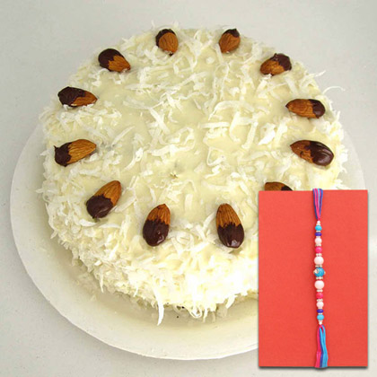 Product Overview • Rakhi: Single beaded Rakhi • Flavor of Cake: White Almond Cake • Weight: 500 gms • Knife is inclusive with cake • A packet of roli and rice is complementary with the combo Raksha Bandhan is an occasion which gives an additional opportunity to you to express your love towards your darling brother. Let take the full benefit of the occasion and give this wonderful combo of Rakhi to your dearest brother and convey your love towards him with ease. This is the perfect combo which will enhance the joy of the festival. Hurry up and place an order of it now.