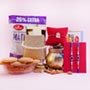 Product Details: • One golden Ganesha Rakhi and Two Evil Eye Rakhis • One pack of Haldiram Matthi of 225gm • 100gm of Assorted Chocolates packed in a designer box • 100gm of Almonds packed in a designer box • One pack of Haldiram Kaju Cookies of 200gm • Roli and chawal with containers are also included.