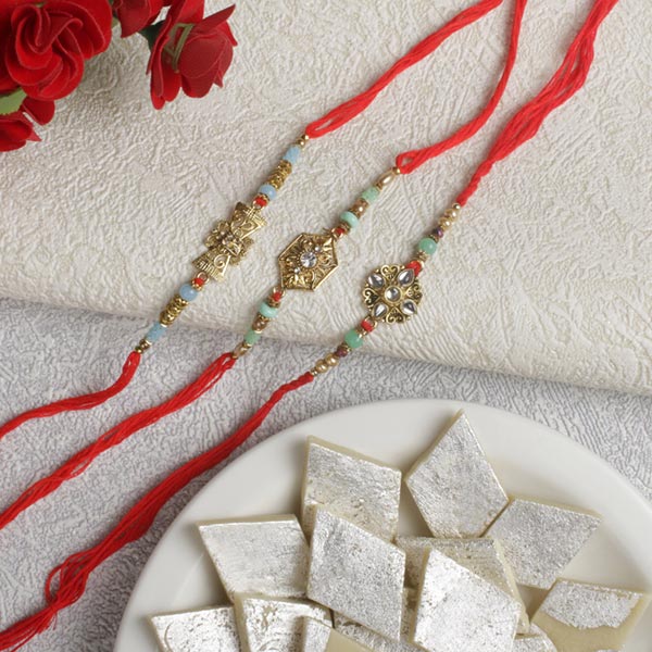 Three Beautiful Rakhis with Kaju Katli For UK