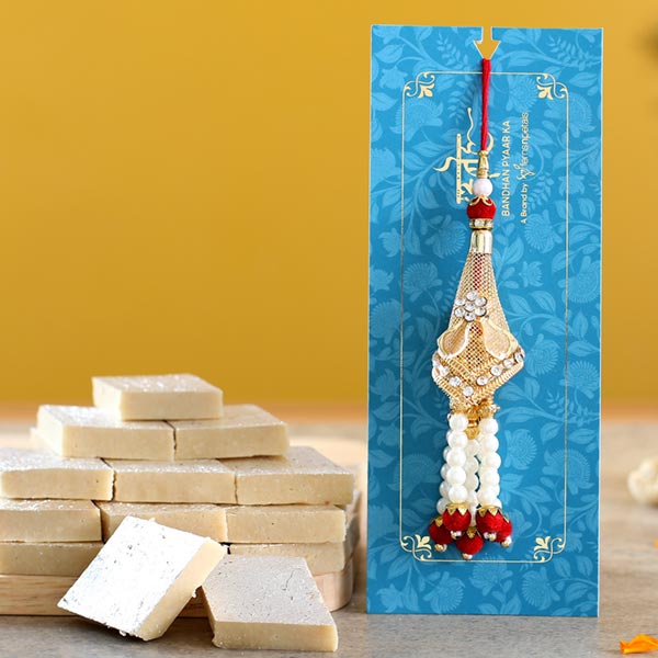 Product Details One Pearl Golden Lumba Rakhi, Intricately designed Rakhi with pearls for a traditional look, Lumba Rakhi with trendy colours and patterns for your precious sister, Haldiram Kaju Katli, Weight- 250 gms,