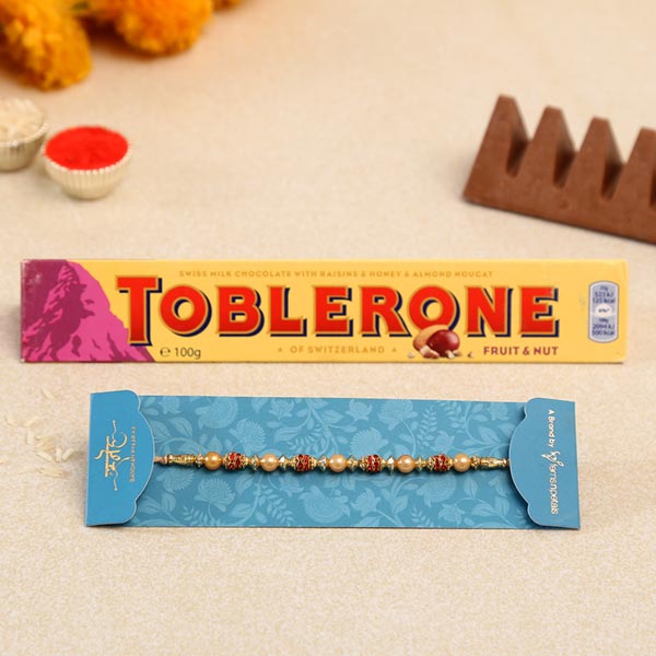 Product Details One Golden Pearl Rakhi, This rakhi displays golden pearl detailing for a festive look, Toblerone Chocolate Milk Bar, Weight- 100 gms, Complimentary Roli Chawal packed in a small card, Beautifully packed in Sneh Box