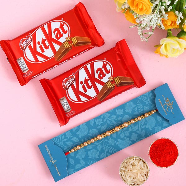 Product Details Minimalistic in design, this rakhi is designed with pearls for an Indian look, Kitkat Chocolate- 2 Pcs, Weight- 42 gms each, Complimentary Roli Chawal packed in a small card, Beautifully packed in Sneh Box,