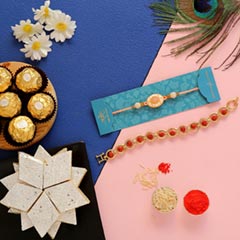 Product Details One Pearl & Mauli Rakhi, This rakhi displays golden pearl detailing for a festive look, Haldiram Kaju Katli, Weight- 250 gms, Complimentary Roli Chawal packed in a small card, Beautifully packed in Sneh Box