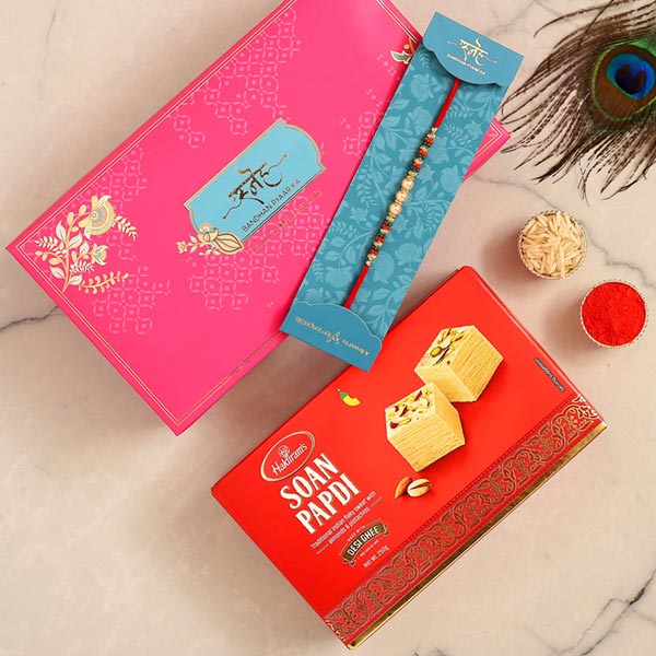Product Details One Pearl & Mauli Rakhi, This rakhi displays golden pearl detailing for a festive look, Haldiram''s Soan Papdi, Weight- 250 gms, Complimentary Roli Chawal packed in a small card, Beautifully packed in Sneh Box