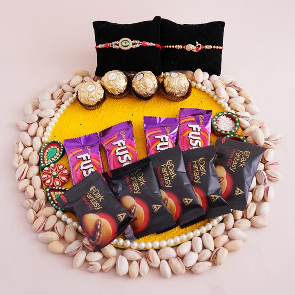 Product Overview: • Rakhi Type: Designer Golden Rakhi • Set Type: Set of Two • Recipient: Brothers • Color: Multicolored • Material Used: Gold-platted metal, beads, stones, and silk threads • A packet of Roli and Chawal with containers Dry fruits • 100 gm pistachio Chocolates • A pack of Cadbury Fuse Bites of 170.5 gm • A pack of Dark Fantasy of 75 gm • A pack of 4 pieces Ferrero Rocher of 50 gm Other Gifts • A designer Puja Thali