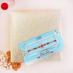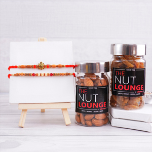 Rakhi • Rakhi Type: One Golden Rakhi and One Beaded Rakhi • Set Type: Set of Two • Recipient: Brothers • Color: Multicolored • Material Used: Gold-platted metal, beads, stones, and silk threads • A packet of Roli and Chawal with containers Dry fruits • 100 gm Cashews • 100 gm Almonds Other Gifts • A designer wooden tray