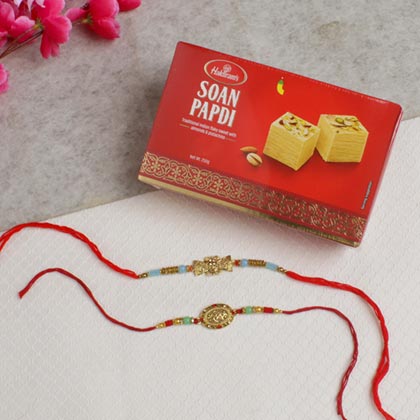 Two Fancy Designer Rakhis With Soan Papdi - For Europe