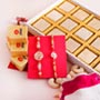 Product Details • Rakhi Type: Designer Rakhi • Set Type: Set of Two Rakhis • Recipient: Brothers • Color: Multicolored • Material Used: Gold-plated metal, stones, beads, and silk threads • Brand:sendrakhi • A packet of Roli and Chawal with containers Dry fruits • 100 gm Cashews in a designer potli Chocolates • One chocolate tray with assorted chocolate Sweets • 250 gm Haldiram Mewa Bite