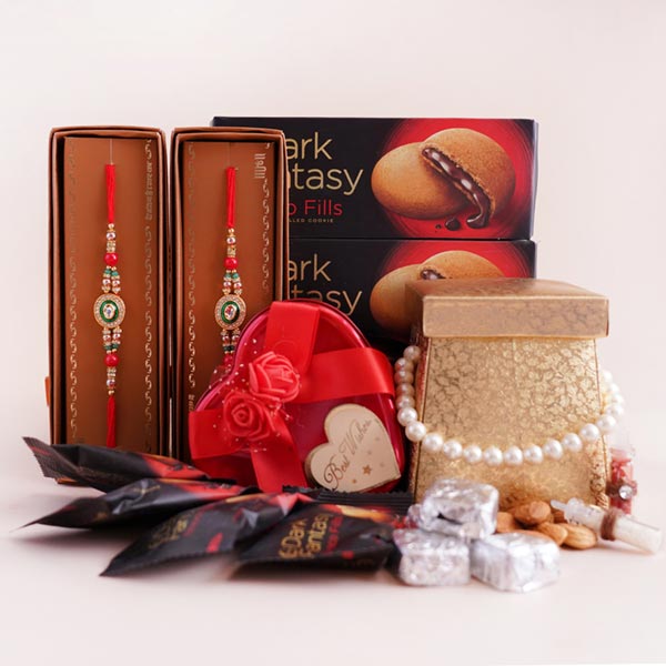 Product Overview: • Rakhi Type: Two Golden Stone Rakhis • Set Type: Set of 2 Rakhis • Recipient: Brothers • Color: Multicolored • Material Used: Gold-platted metal, beads, stones, and silk threads • A packet of Roli and Chawal with containers Dry fruits • 100gm Almonds in a designer container Chocolates • 100gm Assorted chocolate in a box • Two packs of Dark Fantasy boxes of 75 gm