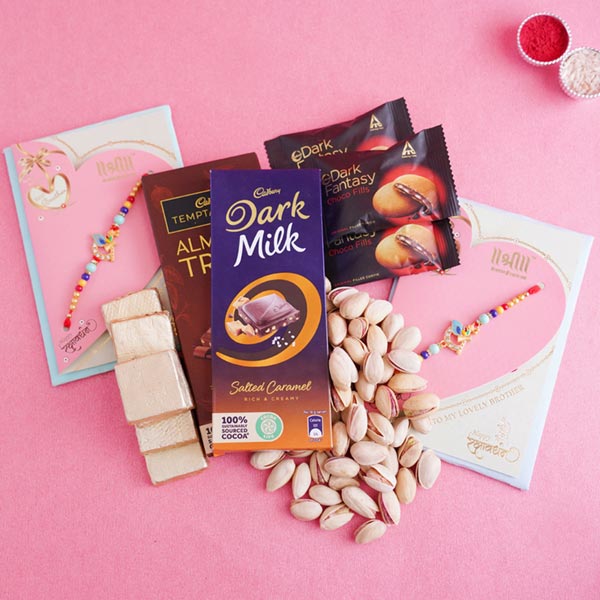 Product Overview: • Rakhi Type: Golden Mor Pankh Krishna Rakhi • Set Type: Set of 2 Rakhis • Recipient: Brothers • Color: Multicolored • Material Used: Gold-platted metal, beads, stones, and silk threads • A packet of Roli and Chawal with containers Dry fruits • 100gm of Pistachios Chocolates • 1 Dark Milk Salted Caramel of 72gm • A pack of Dark fantasy of 75 gm • 1 Temptation Almond Treat of 72gm • 100gm Assorted chocolates