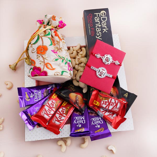 Product Details: • Two designer Silver Rakhis for brother • 100gm of Cashews packed in a designer potli • One pack of Dark Fantasy of 75 gm • 4 KitKat chocolates each of 12gm • 4 Cadbury Dairy Milk chocolates of 12gm each • One designer tray • Roli and chawal with containers are also included
