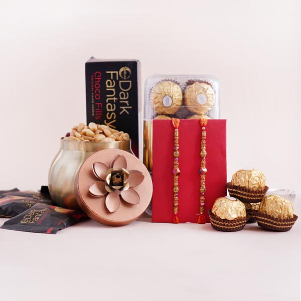 Product Overview: • Rakhi Type: Two Designer Stone Rakhis • Set Type: Set of Two Rakhis • Recipient: Brothers • Color: Multicolored • Material Used: Gold-platted metal, beads, stones, and silk threads • A packet of Roli and Chawal with containers Dry fruits • 200 gm of Salted Peanuts Chocolates • A pack of Dark Fantasy of 75 gm • 16 pieces of Ferrero Rocher chocolates Other Gifts • A designer container
