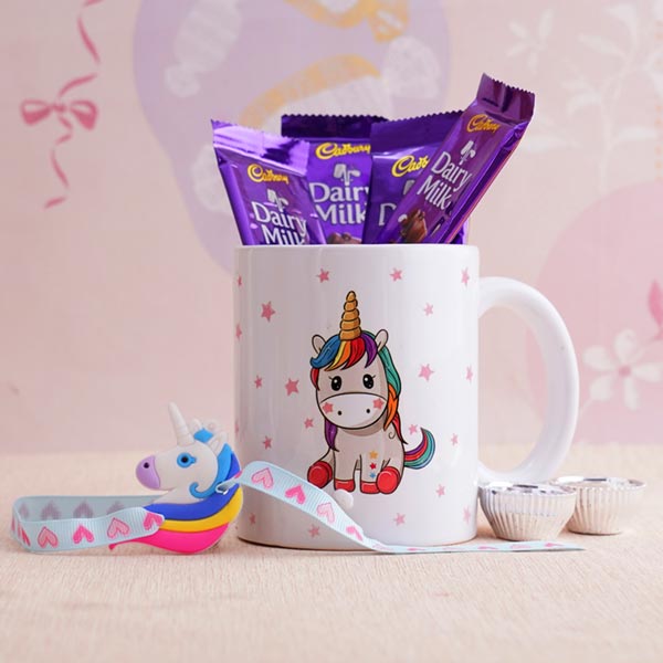 Product Details: • Rakhi Type: Unicorn Kids Rakhi • Set Type: Single • Recipient: Brothers • Color: Multicolored • Material Used: Fabric, plastic, ribbon, and stylish band. • Brand: Sendrakhi.com • Roli & Chawal with containers are included Chocolates • 4 Dairy Milk chocolates of 12 grams each Mug • One Unicorn mug