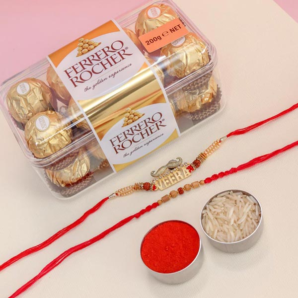 Veera & Sandalwood Beads Set of 2 Rakhis With Ferrero Rocher