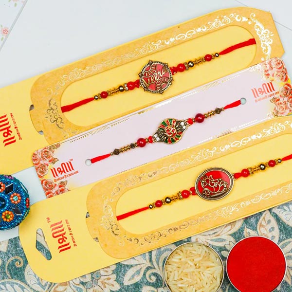 Set of 3 Rakhis ( 1 Veera Rakhi, 1 Om Rakhi & 1 Ganesha Rakhi )