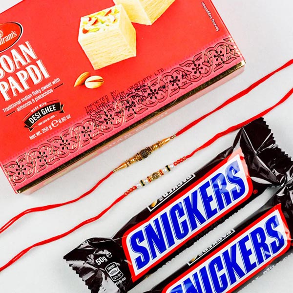 White Golden Pearl Set of 2 Rakhis With Soan Papdi & Snickers
