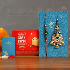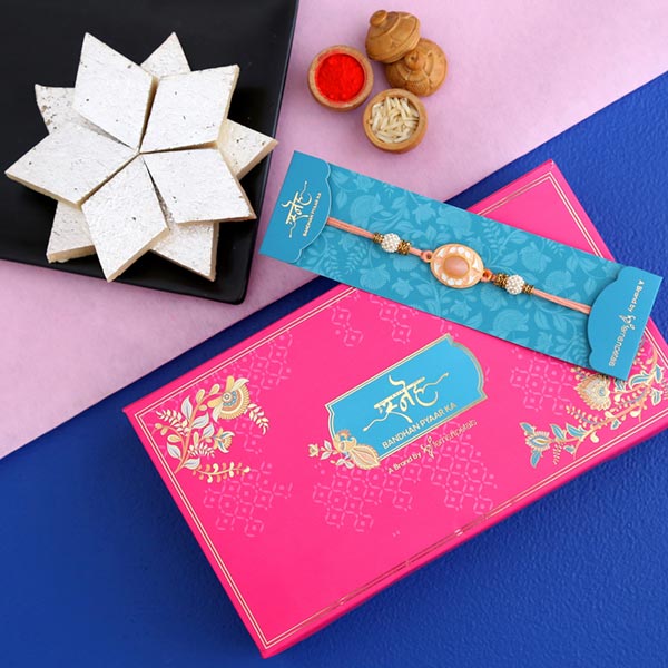 Product Details One White Peach Stone Rakhi, This designer rakhi highlights a white peach stone for a graceful look, Haldiram Kaju Katli, Weight- 250 gms, Complimentary Roli Chawal packed in a small card, Beautifully packed in Sneh Box