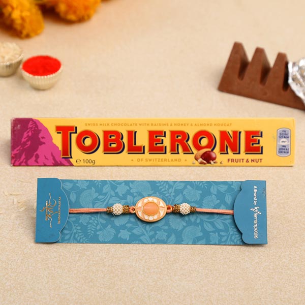 Product Details One White Peach Stone Rakhi, This designer rakhi highlights a white peach stone for a graceful look, Toblerone Chocolate Milk Bar, Weight- 100 gms, Complimentary Roli Chawal packed in a small card, Beautifully packed in Sneh Box