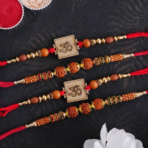 Product Overview: • Rakhi Type: Two wooden OM Rakhis and two Rudraksha Rakhis • Set Type: Set of 4 Rakhi • Recipient: Brothers • Color: Multicolored • Material Used: Rudraksha, wood, beads, gold-plated metal, and silk thread • Roli & Chawal pack and containers are included with Rakhi set