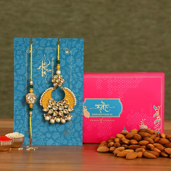 Product Details One Bhaiya Bhabhi Lumba Rakhi Set, Gracefully designed with yellow pearls, This Lumba Rakhi set presents a crescent shape, Almonds- 250 gms, Complimentary Roli Chawal packed in a small card, Beautifully packed in Sneh Box