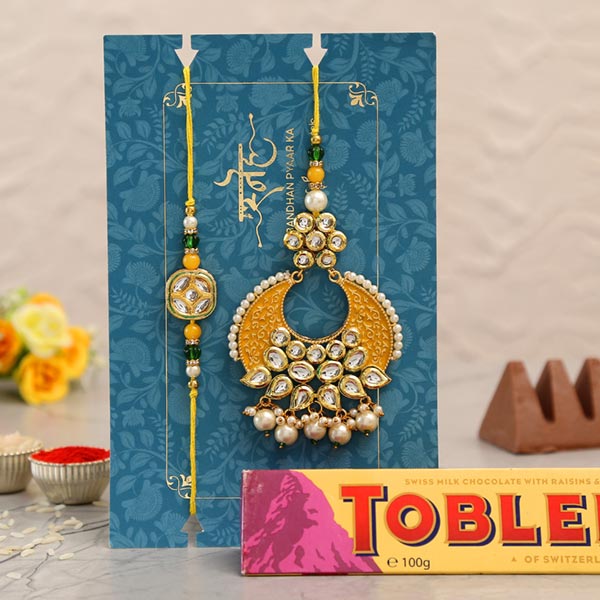 Product Details One Bhaiya Bhabhi Lumba Rakhi Set, Gracefully designed with yellow pearls, This Lumba Rakhi set presents a crescent shape, Toblerone Chocolate Milk Bar, Weight- 100 gms, Complimentary Roli Chawal packed in a small card, Beautifully packed in Sneh Box,
