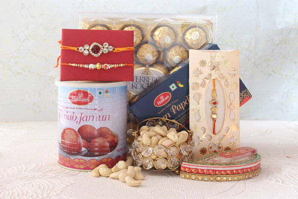 Rakhi is the easy substitute of Rash Potli. An even number of Rakhis should be kept in thali as even number is considered auspicious. The one Rakhi is for Bhaiya and the other is for bhabhi.